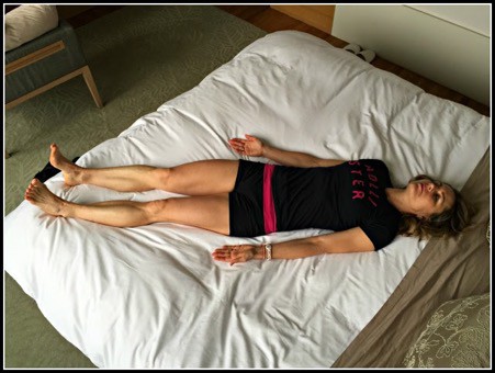 - Lie in bed with your legs slightly apart and stretched out in front of you. Place your arms down by your sides with palms up. Close your eyes and focus on your breathing. Hold this pose for 15 seconds, or until you drift off into a deep, relaxing sleep.