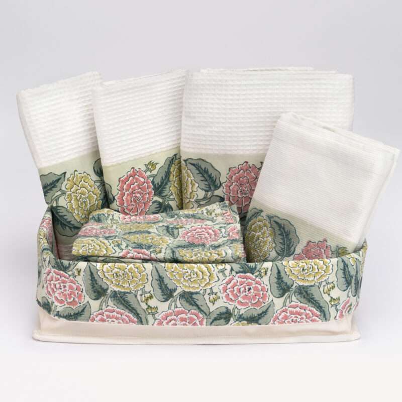 Bathroom sets include a bath and shampoo towel, 2 hand towels and 6 face towels in a lined cotton canvas tray with folded sides that can be adjusted to the height you want. The tray lining is 100% cotton percale which is printed by hand and holds the structure of tray.
